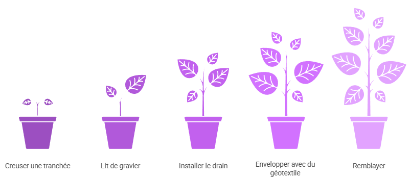 - Installation du drain PVC avec une légère pente (1 à 2 cm par mètre)