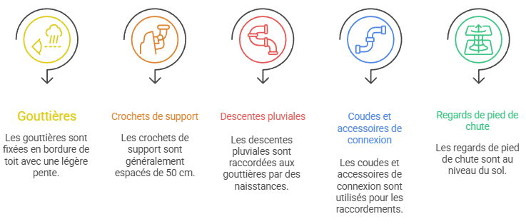 - Les gouttières, fixées en bordure de toit avec une légère pente