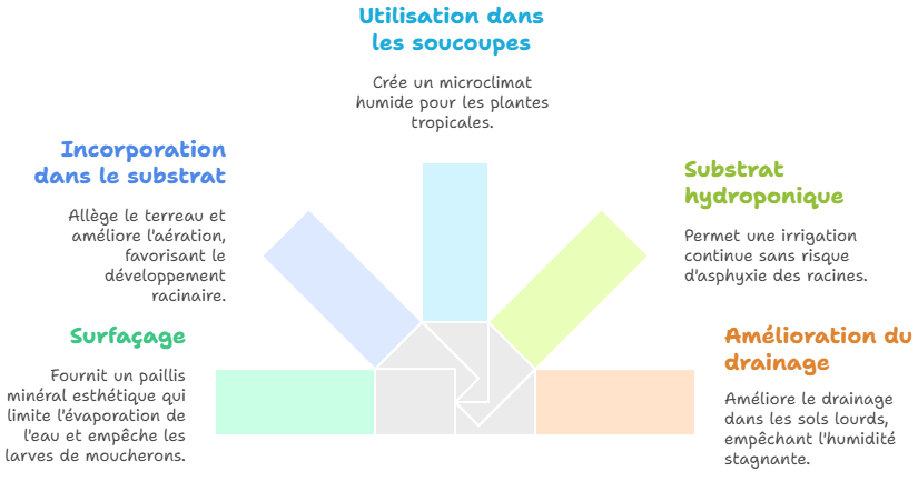 Une autre utilisation que nous apprécions particulièrement consiste à incorporer environ 10% de billes d’argile directement dans le substrat. Cette technique allège considérablement le terreau et améliore son aération, créant ainsi des conditions idéales pour le développement racinaire.